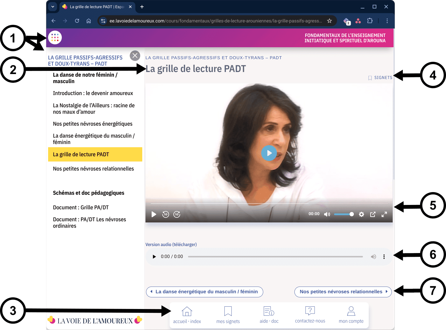 - le nom du cours est mis en évidence grâce à un fond jaune (ici « La grille de lecture PADT ») pour vous indiquer votre progression dans la série